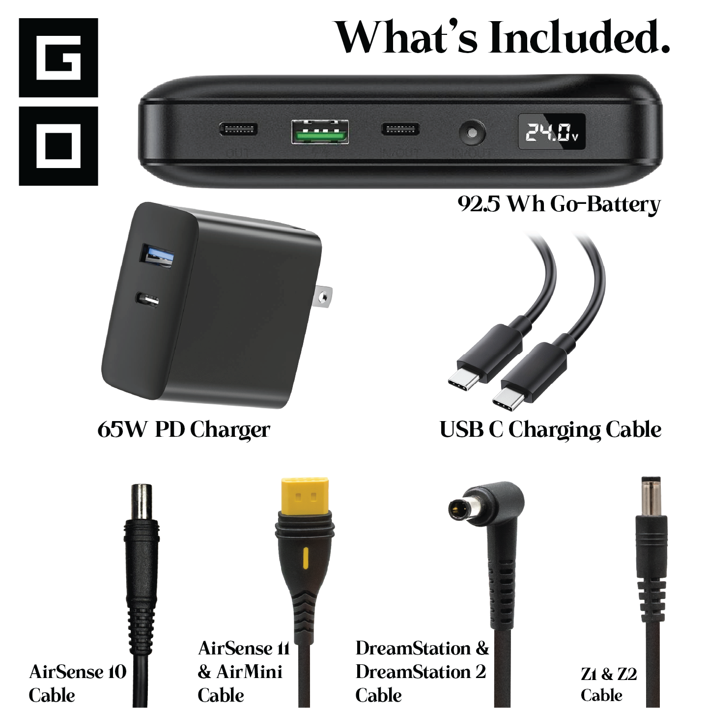 Go-Battery allows you to power your CPAP machine for a great night's rest. This includes: 1 Go-Battery, 1 65W GaN super fast charger, and 4 cables to work across all major CPAP Machines (works with the Airsense 10, AirSense 11, AirMini, DreamStation 1, DreamStation 2, Breas Z1 and Breas Z2 right out of the box). All voltage settings you may need are within Go-Battery in order to be compatible with nearly all CPAP machines.